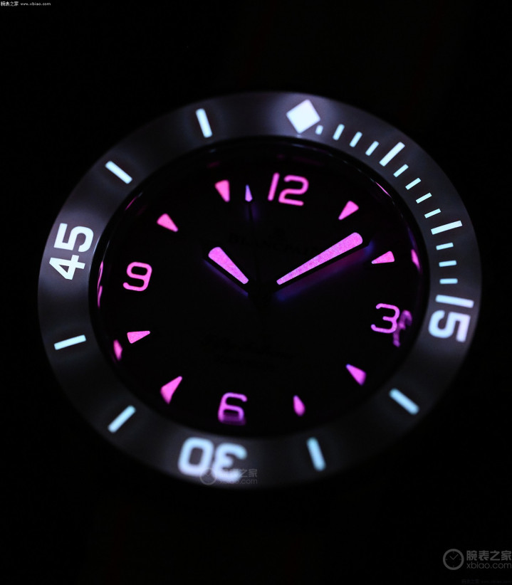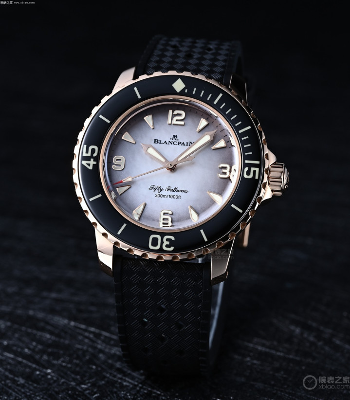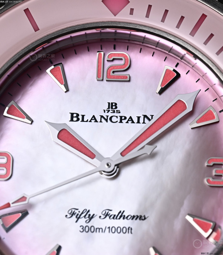 粉色蓝宝石表圈(陶瓷圈加蓝宝石外壳),粉色刻度。手表的珍珠母贝盘面,也是渐变粉色。盘面中央是白色,向四周逐渐变粉。手表的指针、时标,全部填充了粉色夜光涂层。如果说,50噚“黑珍珠”的黑金配色又奢又酷的话,那么这只“粉珍珠”的粉色白色组合,就是又奢又可爱了。