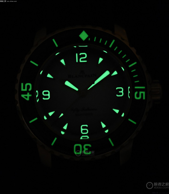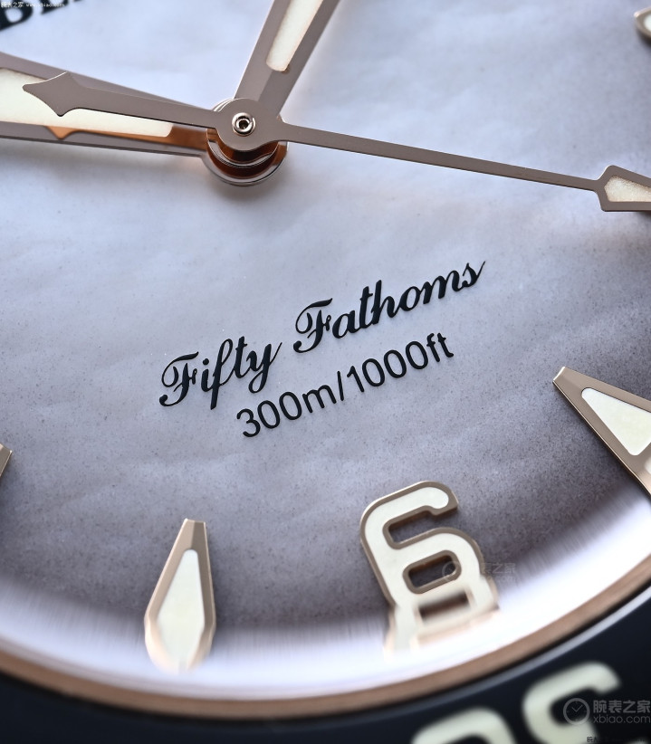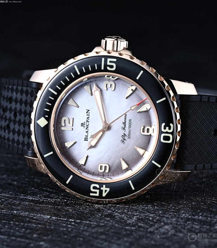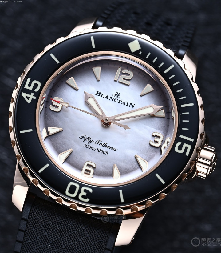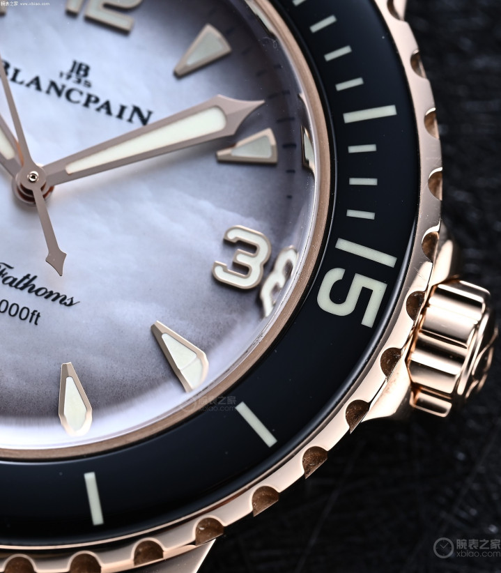 对于一只女表来说,又闪又亮,必然是加分项。宝珀在这只50噚5007上,没有选择镶钻,而是选择了珍珠母贝。珍珠母贝和50噚的潜水表本色,自然也是最搭配的。“黑珍珠”表盘,是白色/黑色渐变母贝,母贝盘面在不同角度的光线下,波光粼粼,效果拔群。