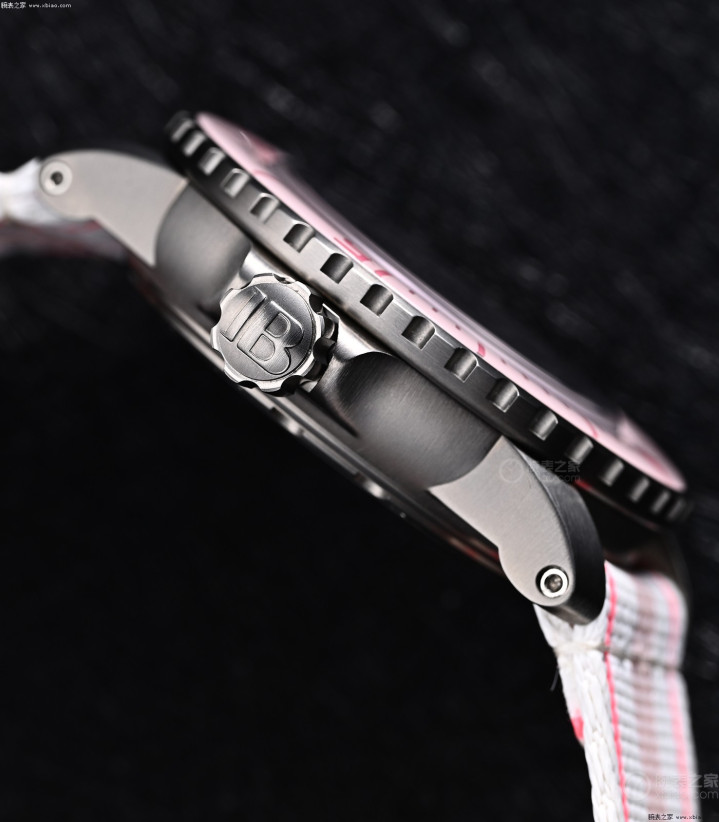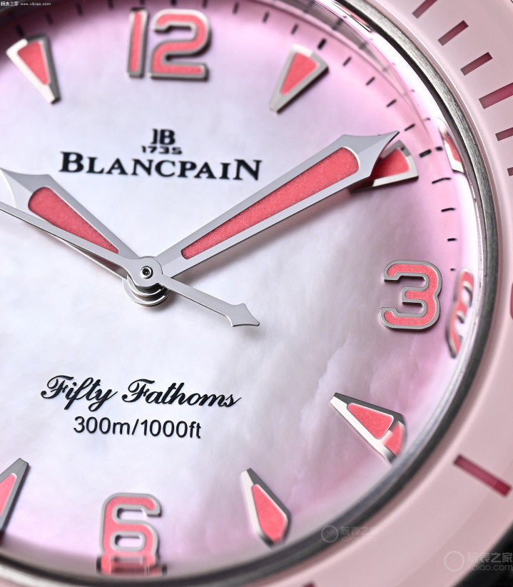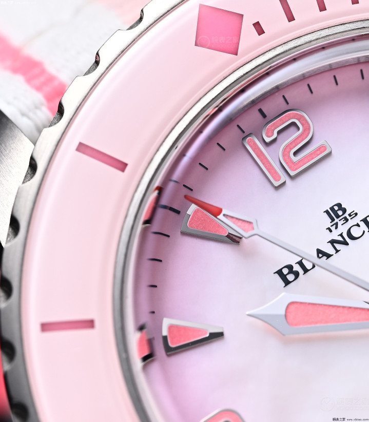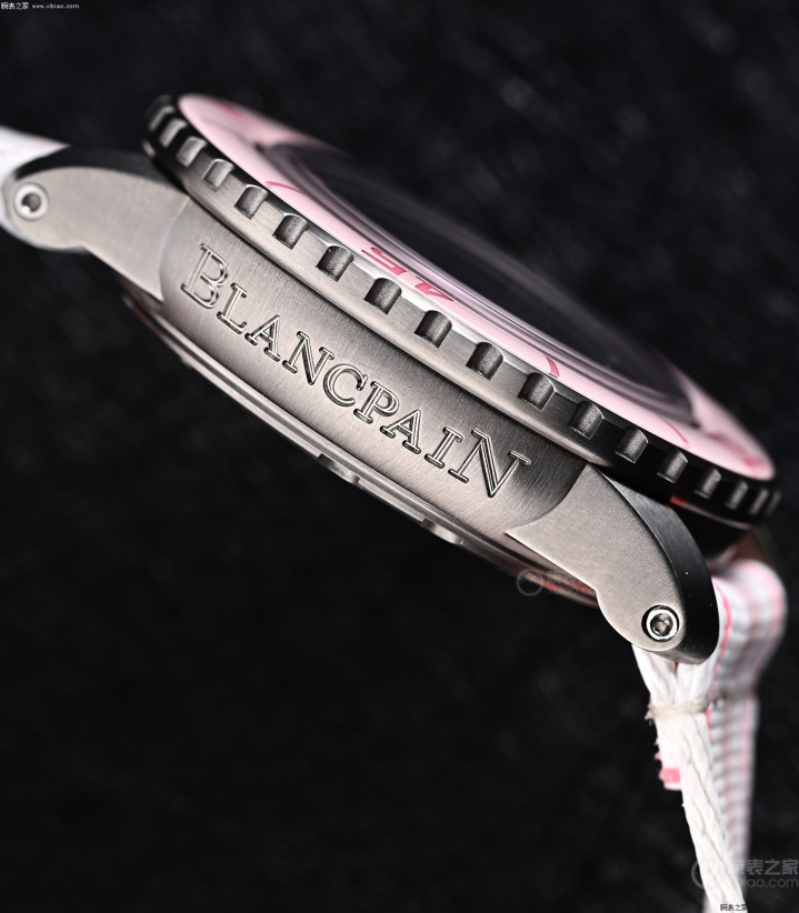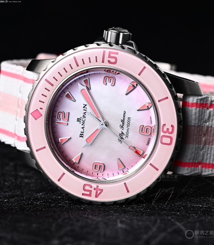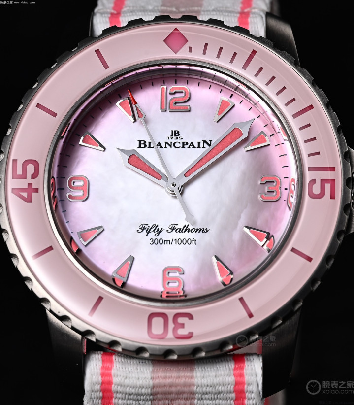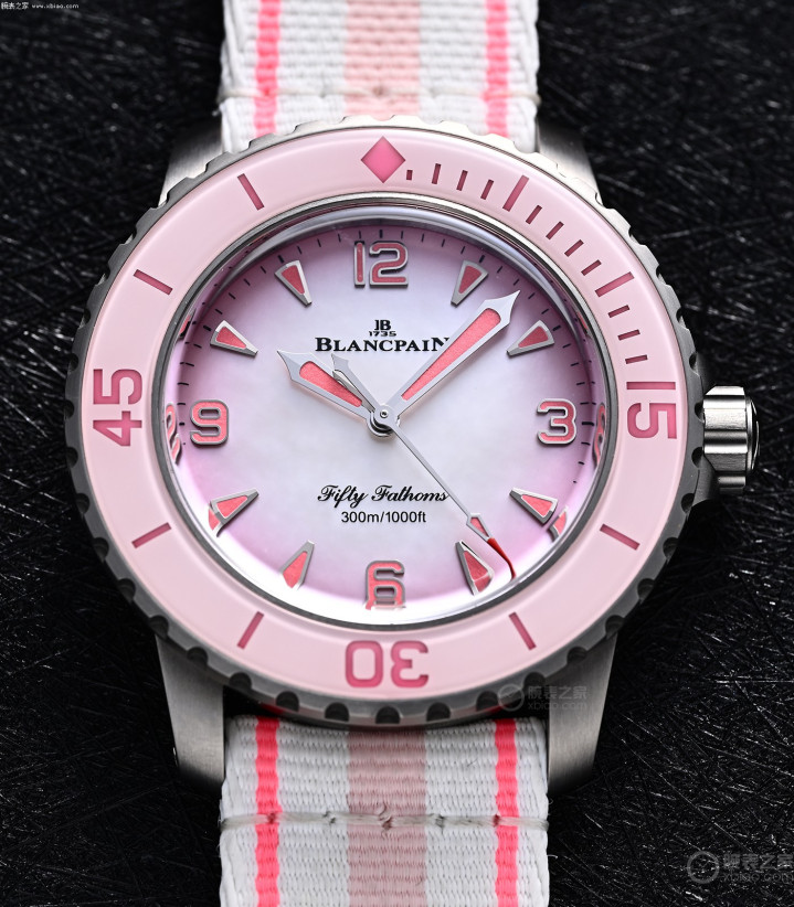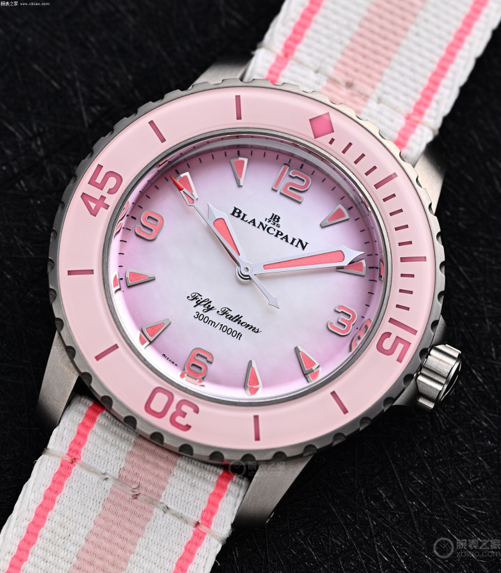 在此之前,粉色配色,我们通常在劳力士日志型粉盘、蚝式恒动粉盘、卡地亚蓝气球粉盘等女表上见到。而在豪华潜水表上,是极为罕见的。而且这次宝珀50噚5007“粉珍珠”,粉的非常彻底,专门给这只手表配了一条粉色/白色相间的帆布表带,这效果可要比钛金属的表链,更胜一筹。