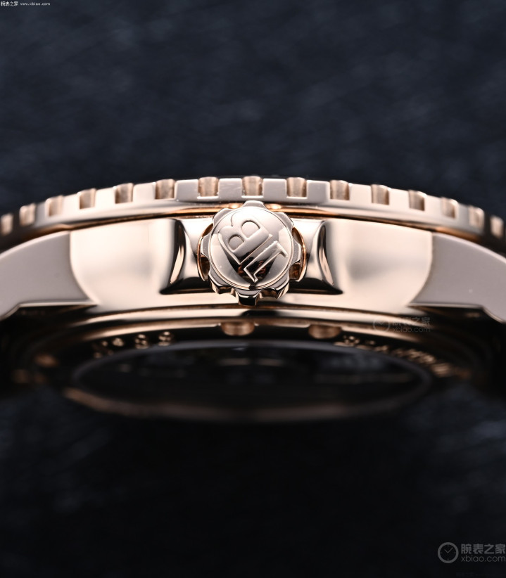 宝珀50噚5007“黑珍珠”是一只金表,18K玫瑰金表壳一上,潜水表的工具感一扫而光,奢华感一下就来了。38毫米的尺寸,12毫米的厚度,50噚5007是目前市面上,尺寸最紧凑的豪华潜水表之一,加上宝珀标志性的、隆起的蓝宝石表圈(陶瓷圈加蓝宝石外壳),整只手表非常精致。