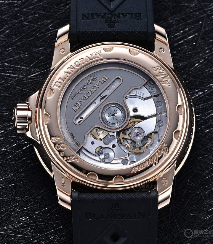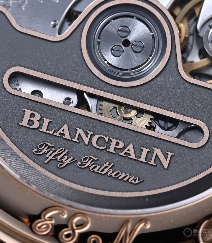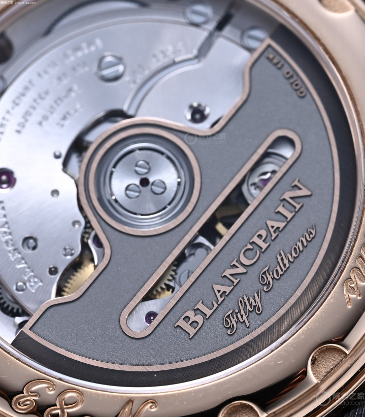 宝珀的机芯,一向以打磨良心闻名。50噚5007“黑珍珠”“粉珍珠”的1153机芯,上层夹板是放射太阳纹装饰,下层夹板打满鱼鳞纹。宝珀在50噚机芯中使用的这种放射太阳纹打磨,是一种更接近古董表机芯的装饰方式。同时我们可以看到50噚5007,使用了新的自动陀造型,18K金自动陀镀黑并包边,在自动陀中间,有一道“开口”。这是模仿了上世纪50年代,古董50噚AS 1361自动机芯的样式。